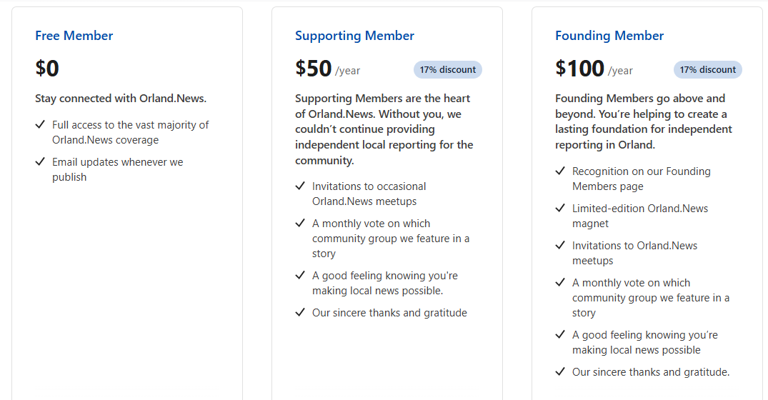 - Supporting Member ($5/month or $50/year): Get access to our occasional Orland.News meetups, help choose which community group we feature each month (through a member vote), and know you’re helping to keep Orland.News free for everyone.